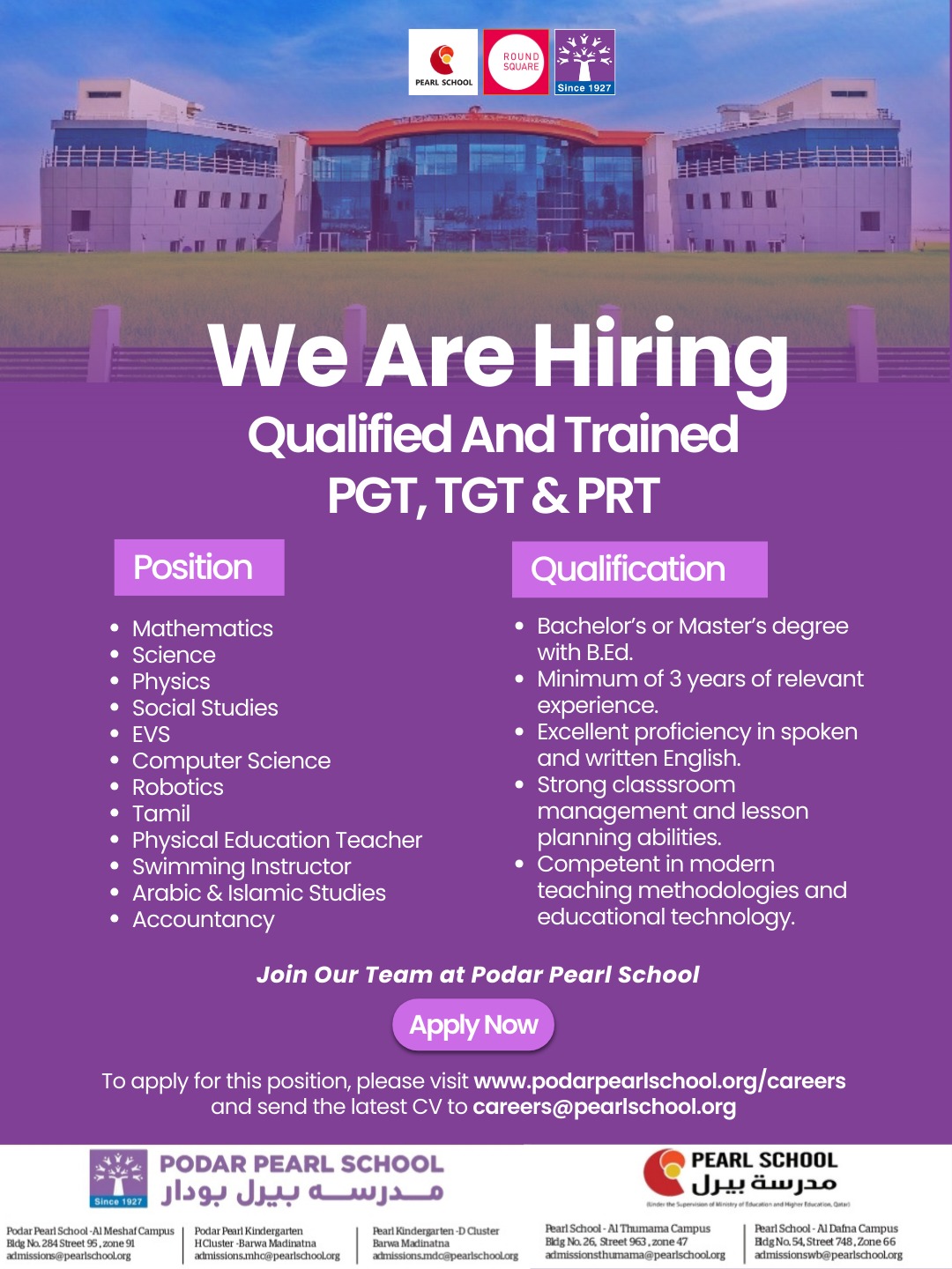 Careers If you are an educator with a dream and passion for nurturing students, then you should pursue a career with us We are Hiring!! - Click to know more! To Register/login use Candidate Login screen or click on the link below Register/Login
