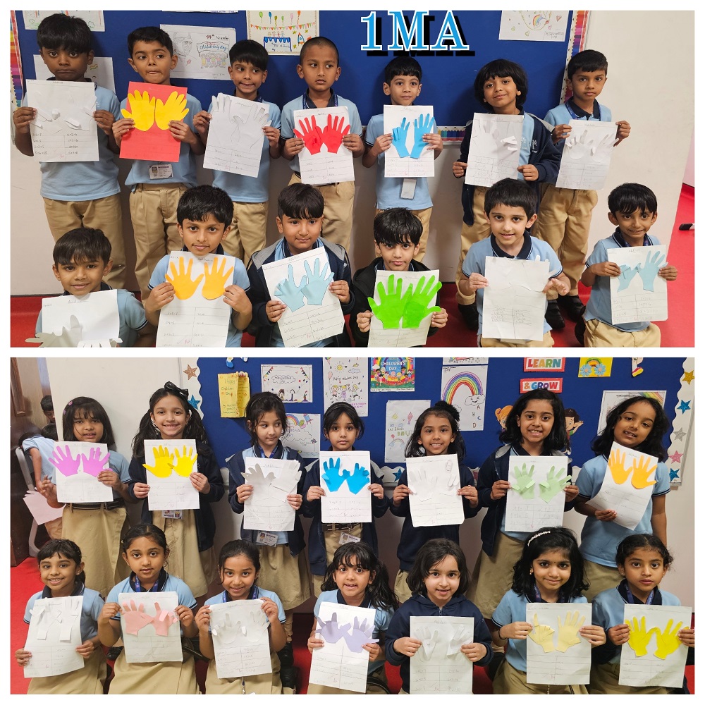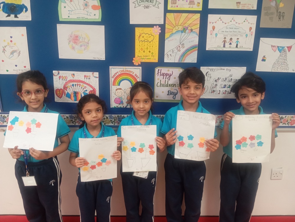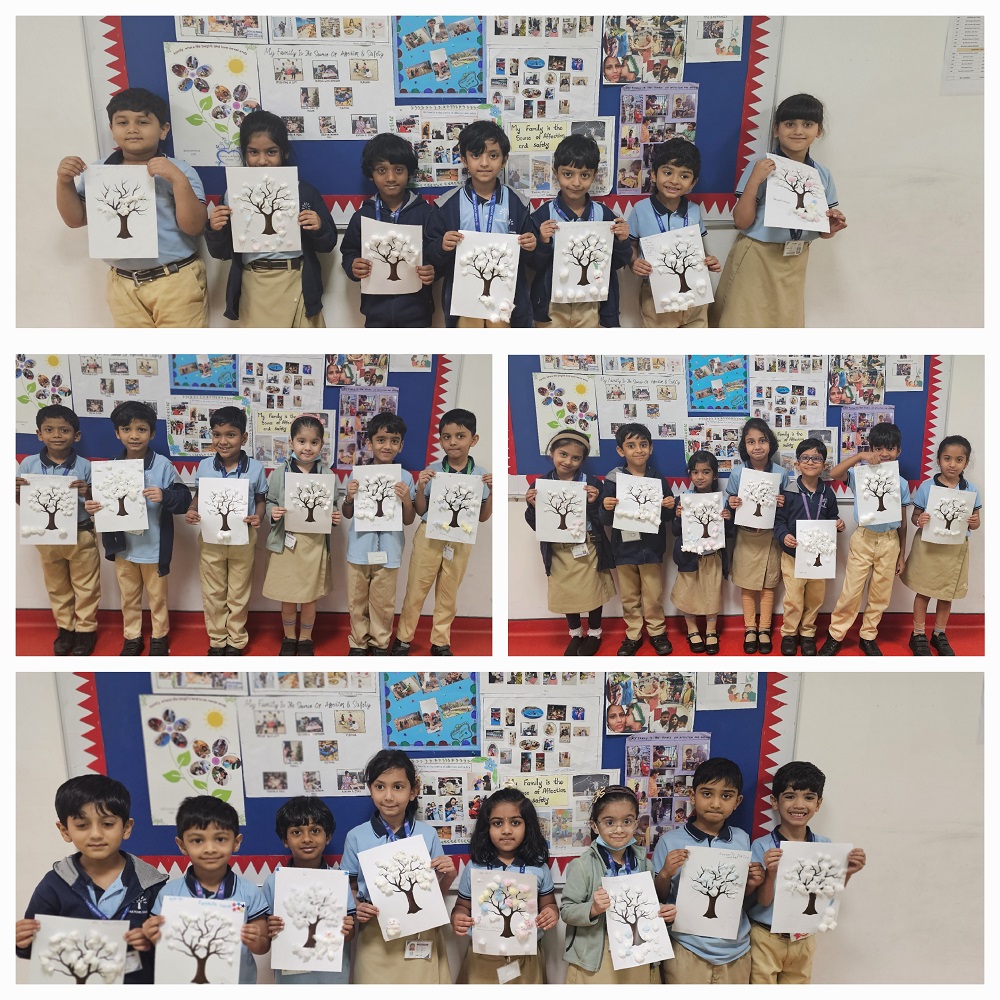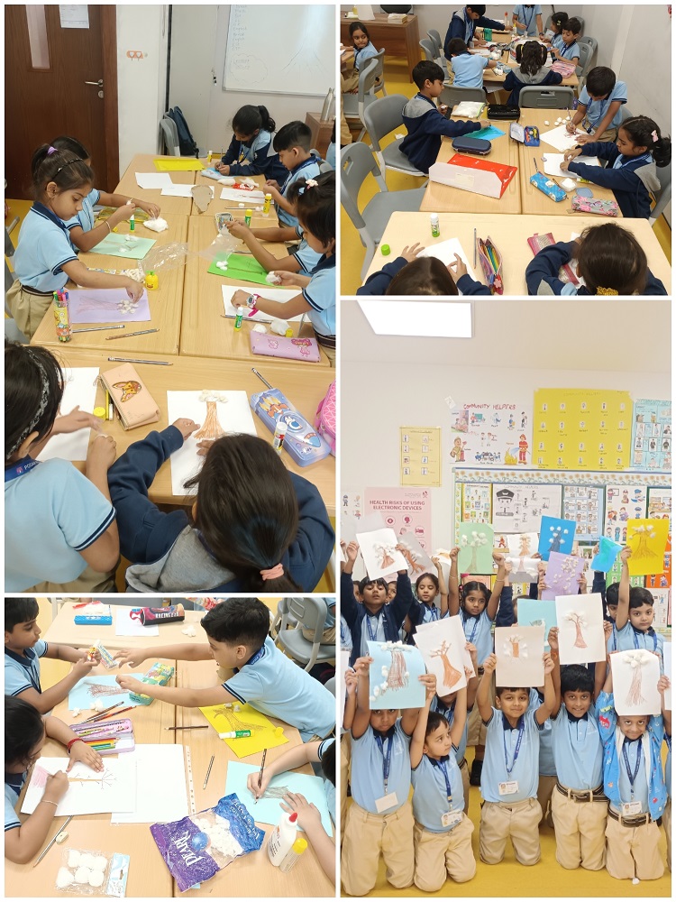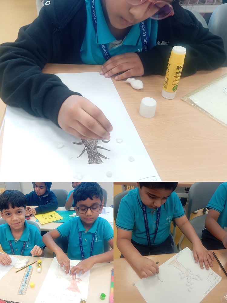 - Description: Grade 1 students did an activity on genders. They drew 2 flower pots representing masculine and feminine gender, some examples of them were written on the flowers. Students used palm shaped cutouts as a tool to practice math operations like addition and subtraction. Using an A4 sized sheet of paper, they drew the stem of a tree as the base of their artwork. Finally, they represented the season ‘winter’ using small cotton balls which were creatively stuck onto the branches to depict the snow- covered tree characteristics of winter.