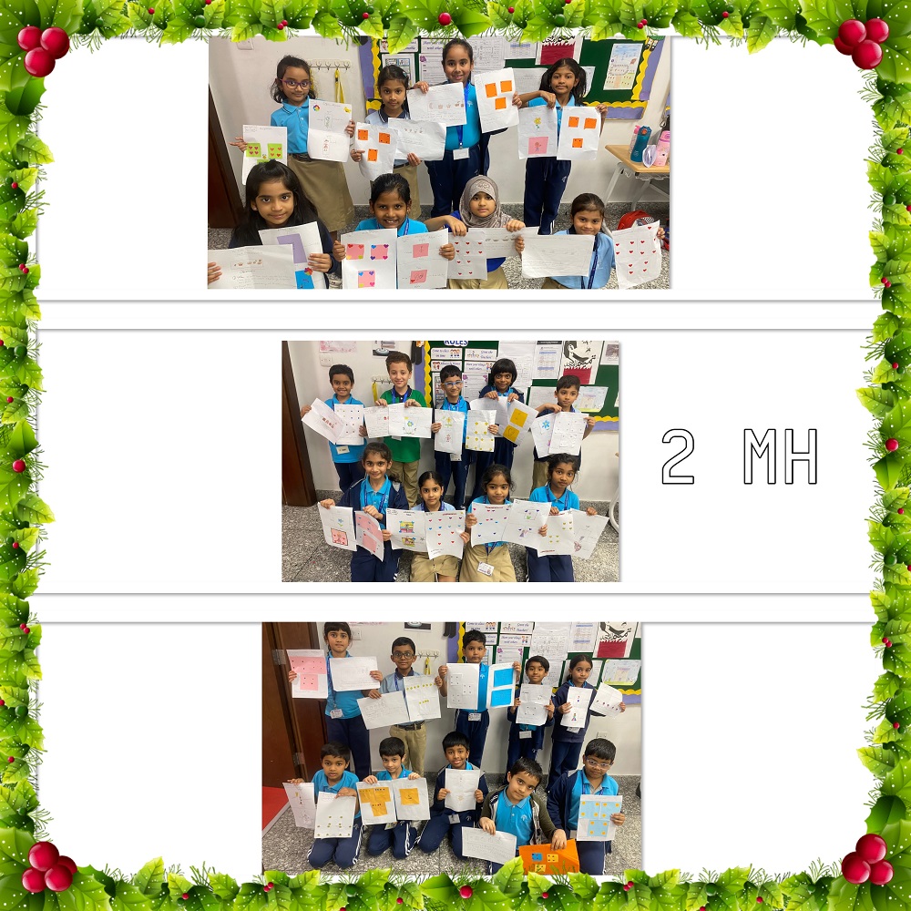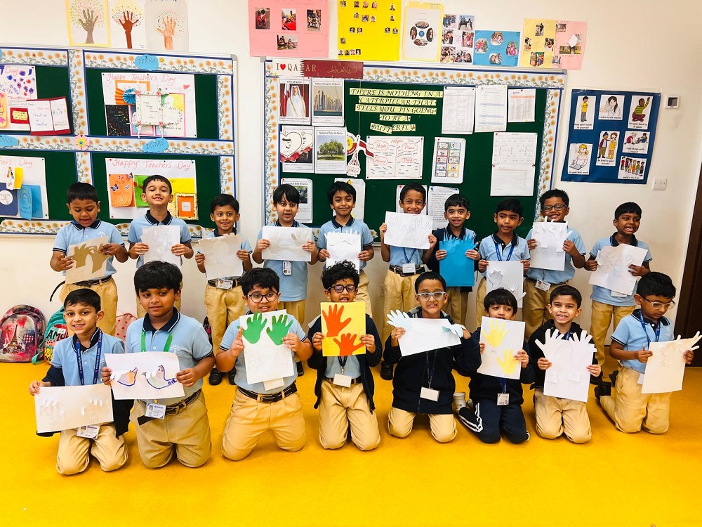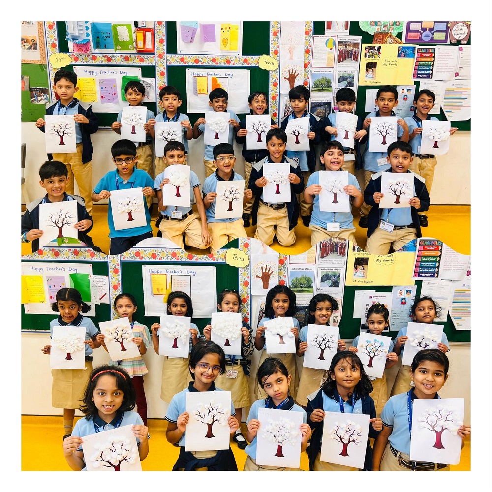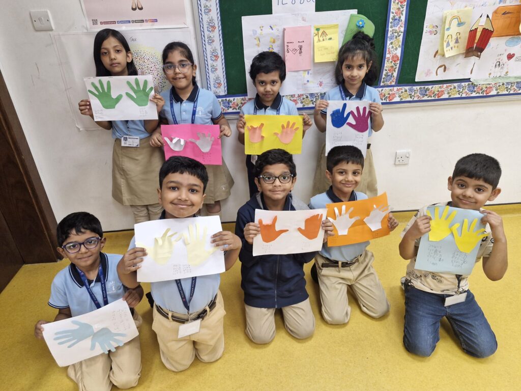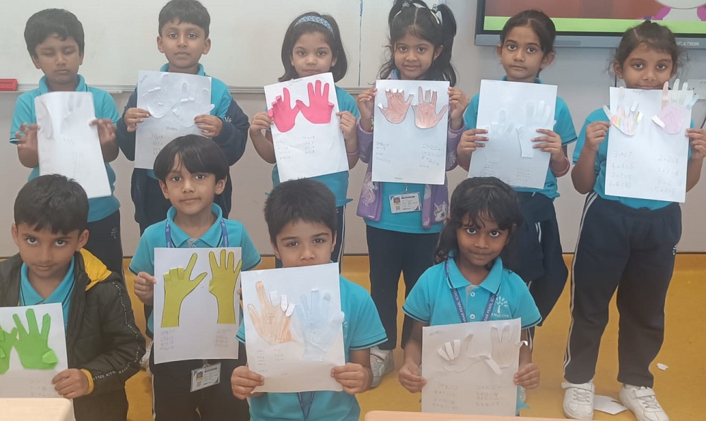 - Description: Grade 1 students did an activity on genders. They drew 2 flower pots representing masculine and feminine gender, some examples of them were written on the flowers. Students used palm shaped cutouts as a tool to practice math operations like addition and subtraction. Using an A4 sized sheet of paper, they drew the stem of a tree as the base of their artwork. Finally, they represented the season ‘winter’ using small cotton balls which were creatively stuck onto the branches to depict the snow- covered tree characteristics of winter.