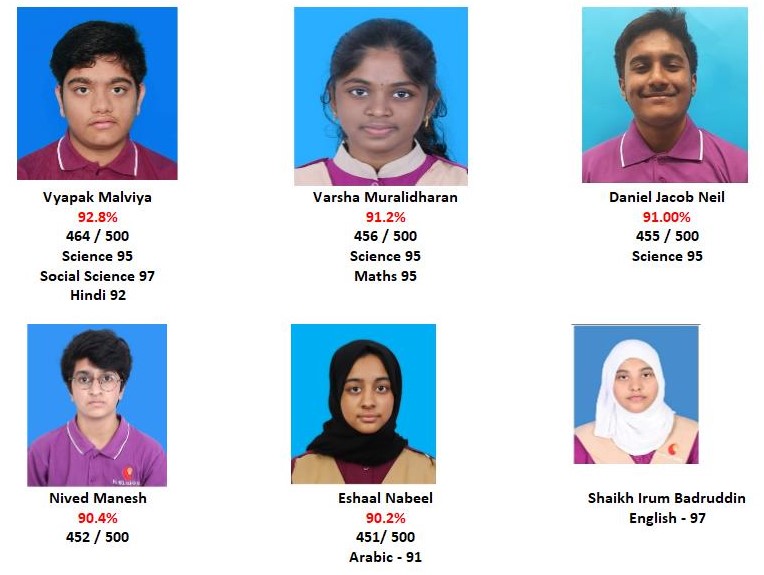 · Vyapak Malviya secured the Ist position with 92.8% · Varsha Muralidharan secured the IInd position with 91.2%. · Daniel Jacob Neil secured the IIIrd position with 91%.