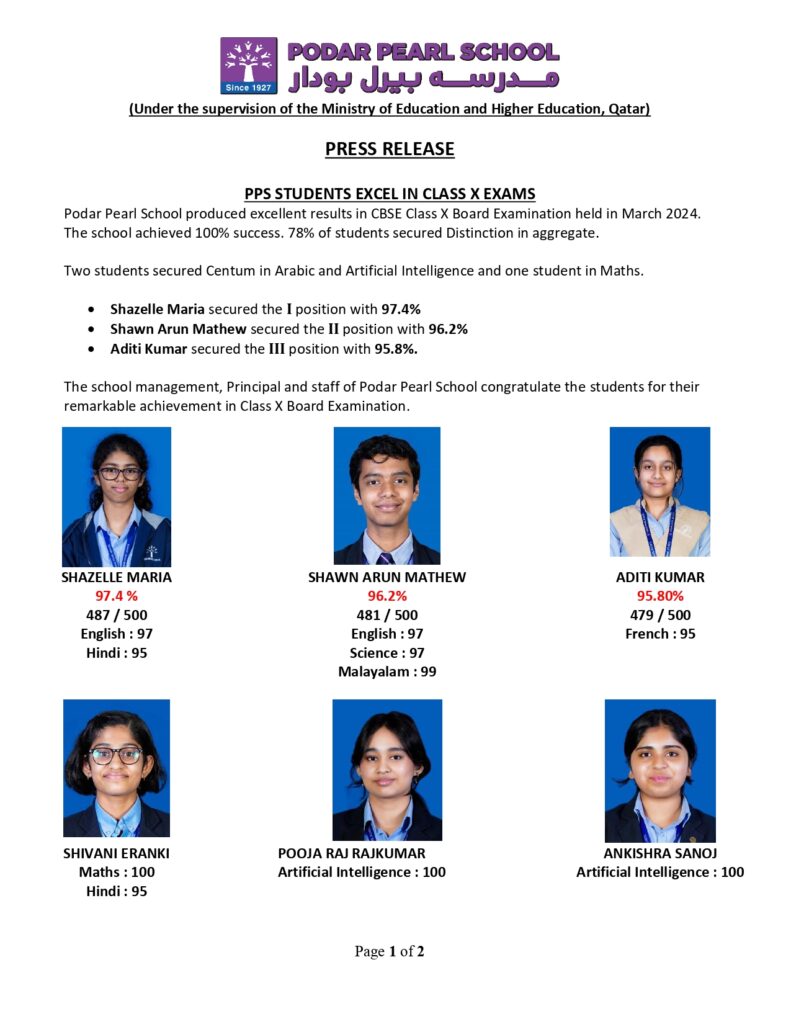 Podar Pearl School By Podar Pearl School > Blog > Achievements & Awards > Grade X (2023-2024) Results Grade X (2023-2024) Results admin@superadmin May 14, 2024 Achievements & Awards 0 Share Tweet Pin it Previous Post Grade 1 & 2: Drawing Competition(Meshaf 2024-25) Next Post Grade XII (2023-2024) Results Related Posts Co-curricular Investiture Ceremony of Value Ambassadors 2025–26 | Pearl School, Al Dafna September 25, 2025 Assembly Hindi Diwas Special Assembly 2025 – Pearl School, Al Dafna, Qatar September 22, 2025 Co-curricular Soft Board Competition – Teachers’ Day | Sep 2025 | Classes I to VIII | Podar Pearl School, Al Dafna September 22, 2025 Comments are closed.