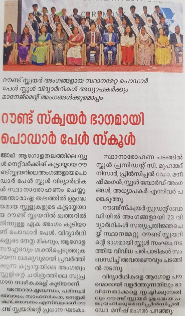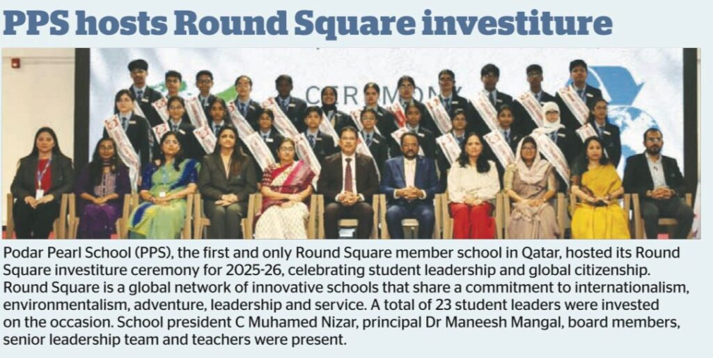 Podar Pearl School By Podar Pearl School > Blog > Media > Podar Pearl School Hosts Round Square Investiture Podar Pearl School Hosts Round Square Investiture admin@superadmin June 22, 2025 Media 0 Share Tweet Pin it Previous Post Educational Initiative: My Values Draw My Identity Next Post Exploring the Wonders of Space: Grades 1–3 Field Trip to Katara Planetarium Related Posts Co-curricular Gandhi Jayanti 2025 Celebration at Podar Pearl School, Al Dafna– Honoring the Father of the Nation October 8, 2025 Star Student Star of the Month – September 2025 | Grades 1 to 8 | Podar Pearl School, Al Dafna Campus October 7, 2025 Star Student Star of the Month – September 2025 | Grades 1 to 12 | Al Meshaf Campus October 7, 2025 Comments are closed.