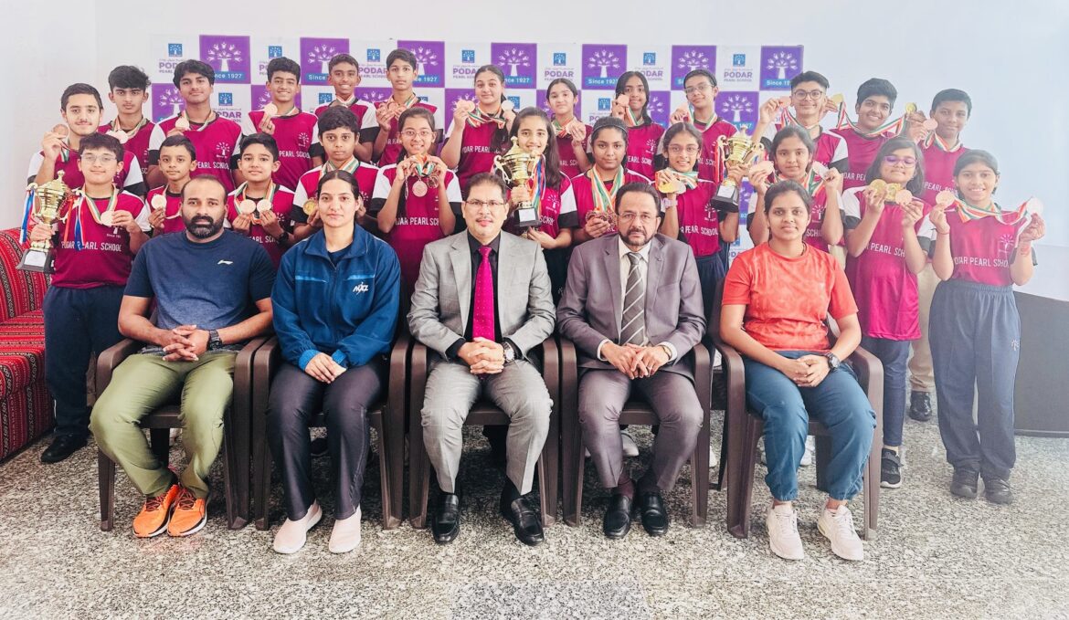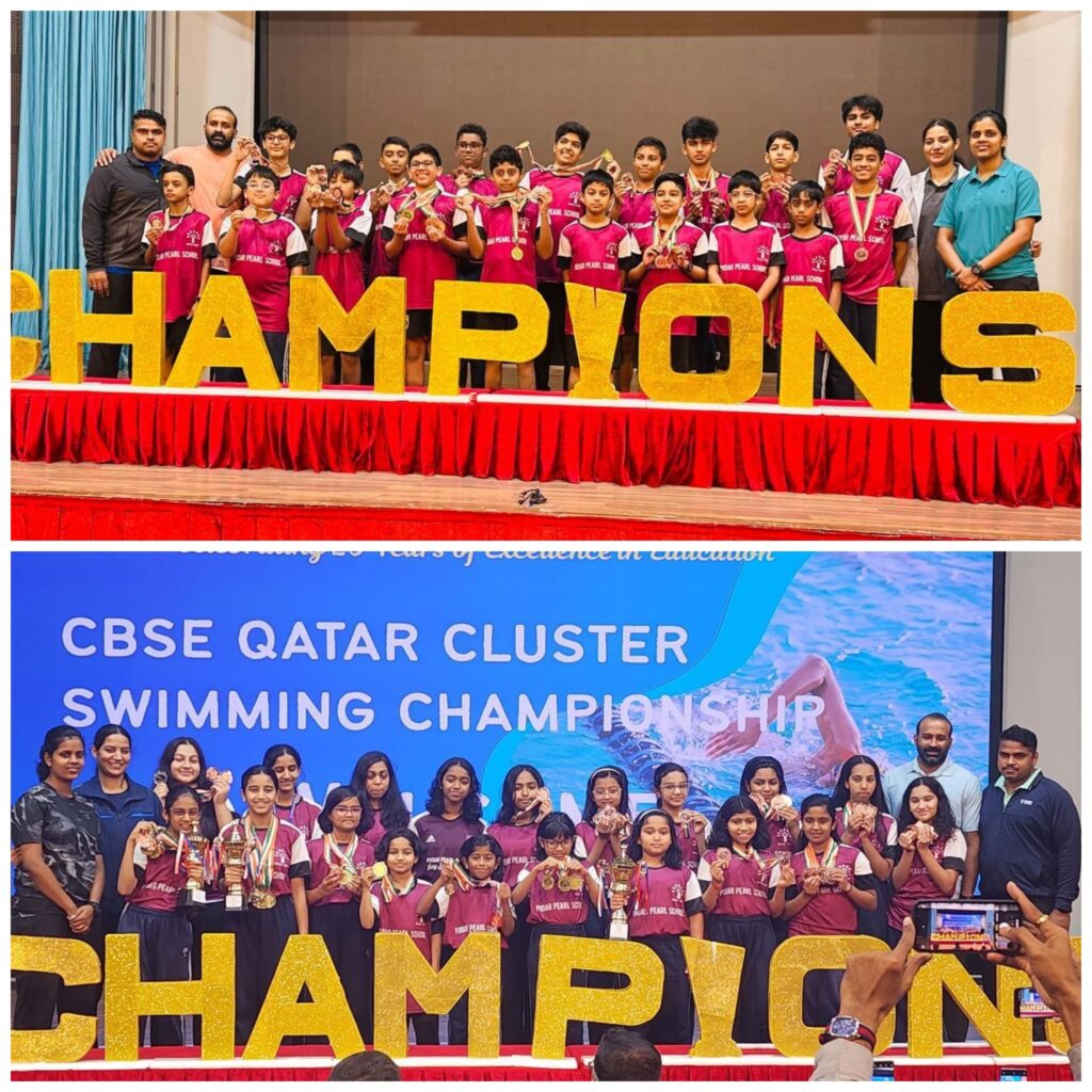 Podar Pearl School delivered a stellar performance at the CBSE Qatar Cluster Swimming Championship held at DPS Modern Indian School. Competing with 13 other schools, our 41-member team (19 girls and 22 boys) won an impressive 81 medals — 18 Gold, 9 Silver, and 54 Bronze.