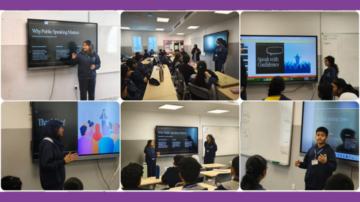 The Public Speaking Training at Podar Pearl School, Al Meshaf Campus aimed to improve students’ confidence, communication skills, and stage presence. Grade 11 Student Council members led the session, demonstrating leadership while guiding their peers. The program focused on clear thinking, overcoming stage fear, and encouraging active participation.